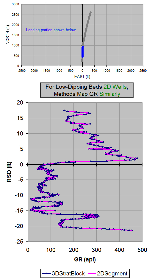 Because the Block Method tunes TrueDip and reports AppDip, it's easy to apply Segment Method transform for comparison. The first two datasets are available through default database install that accompany SES—demo wells named "v5 #2" and "v5 #3," respectively. The intentional characteristic difference between this first well pair is "2D" vs. very-much "3D." Notice how methods match RSD at all depths for "2D" as they should, but not at deepest depths for "3D." For the "3D" well on right the TVT Method would require way more Segments by process than called-for by changed nature, and potentially catch geosteerers "off guard" while deciphering continued puzzling "distortion" while geosteering after the landing and through azimuthal change. What's shown would be similar to "peering into" a U-turn horizontal, but during only a thin sliver of the turn. [SIDEBAR FYI: the well on right is the very one that gave rise to McClure soliciting Stoner in 2005 to add geosteering to SES. And Yes, indeed they did unintentionally blow through the 6 feet thick limestone payzone during the landing of this reentry that even had a logged vertical pilot hole.]