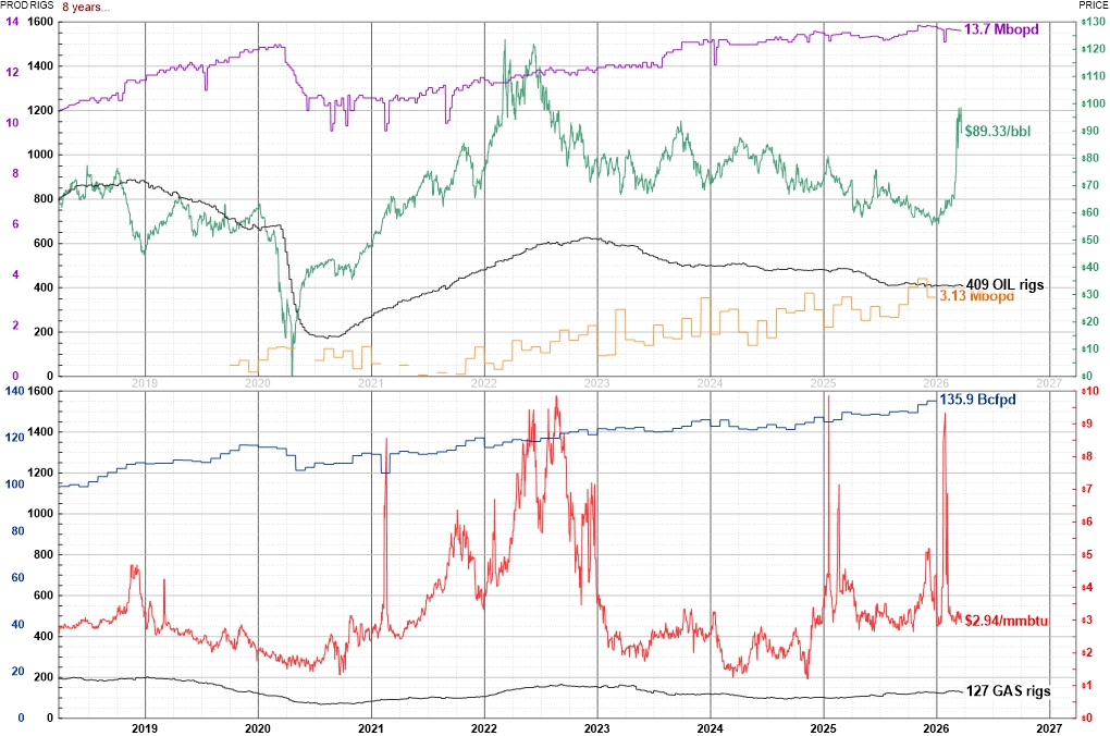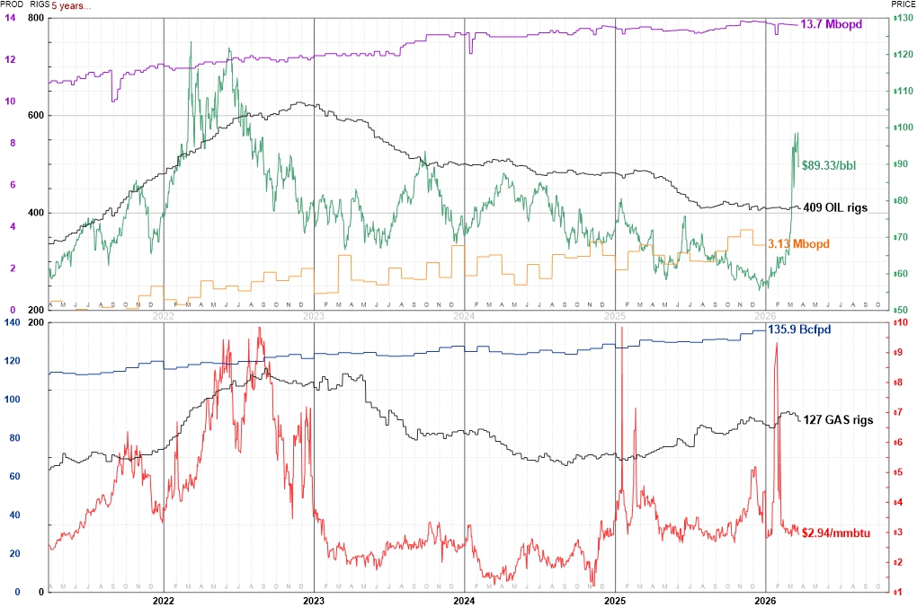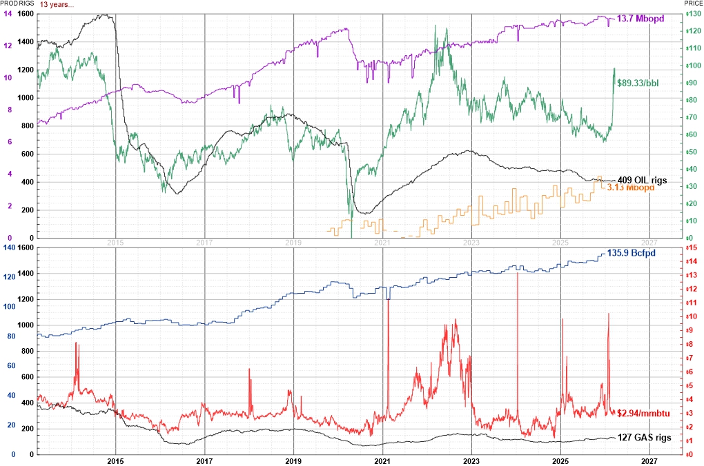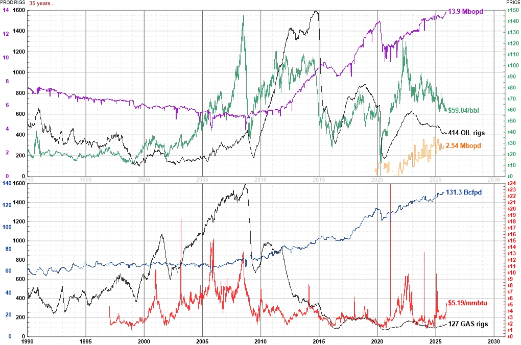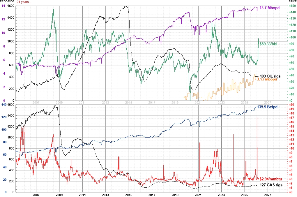 Recent public domain values and historical graphs of USA oil and natural gas rotary drilling rig counts, spot prices, and production rates follow. Images link to enhanced vector-pdfs and may be reproduced without notice.