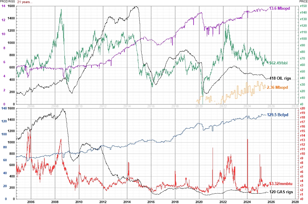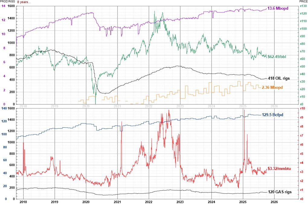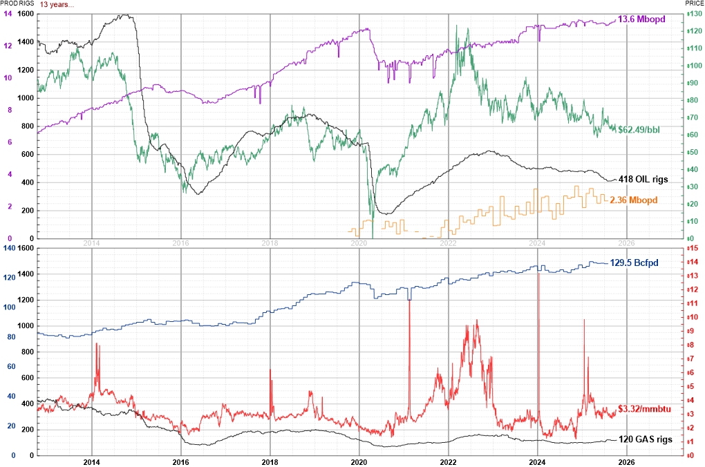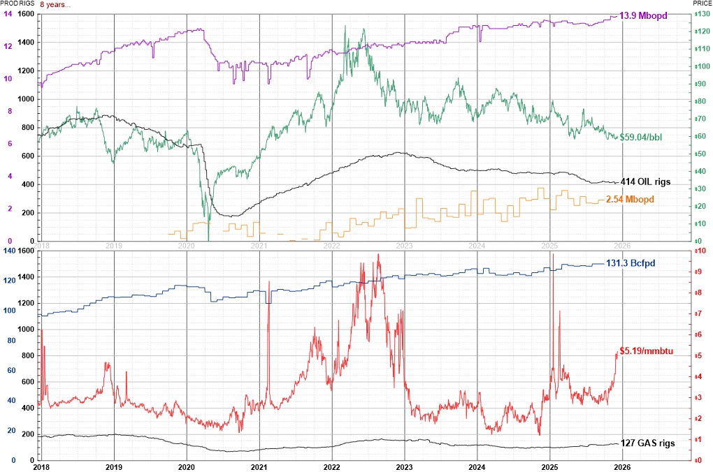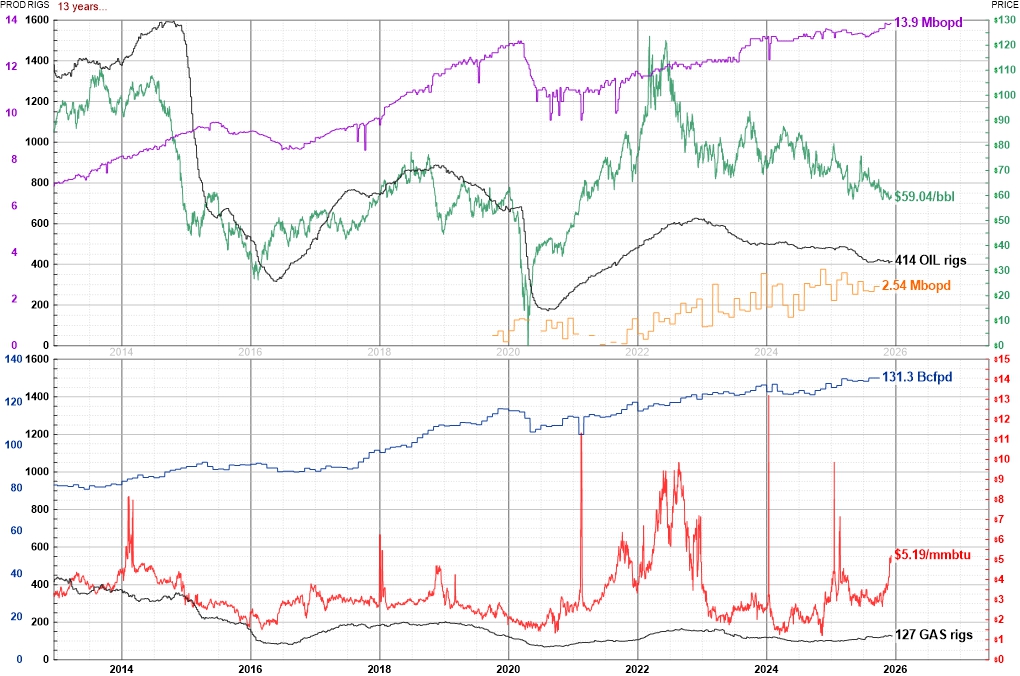 Recent public domain values and historical graphs of USA oil and natural gas rotary drilling rig counts, spot prices, and production rates follow. Images link to enhanced vector-pdfs and may be reproduced without notice.