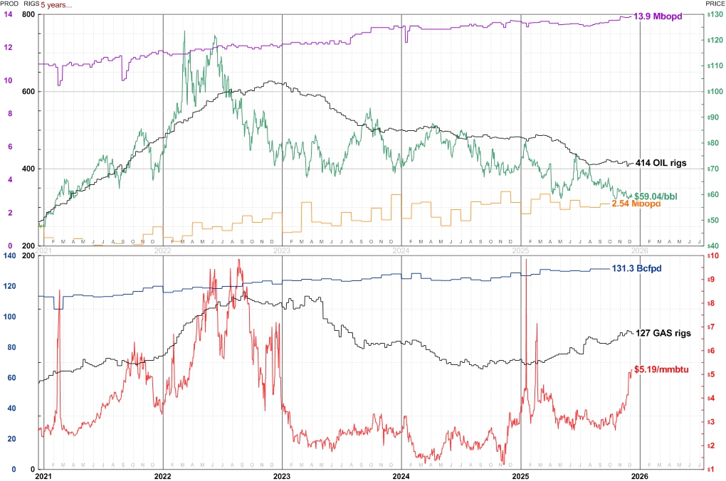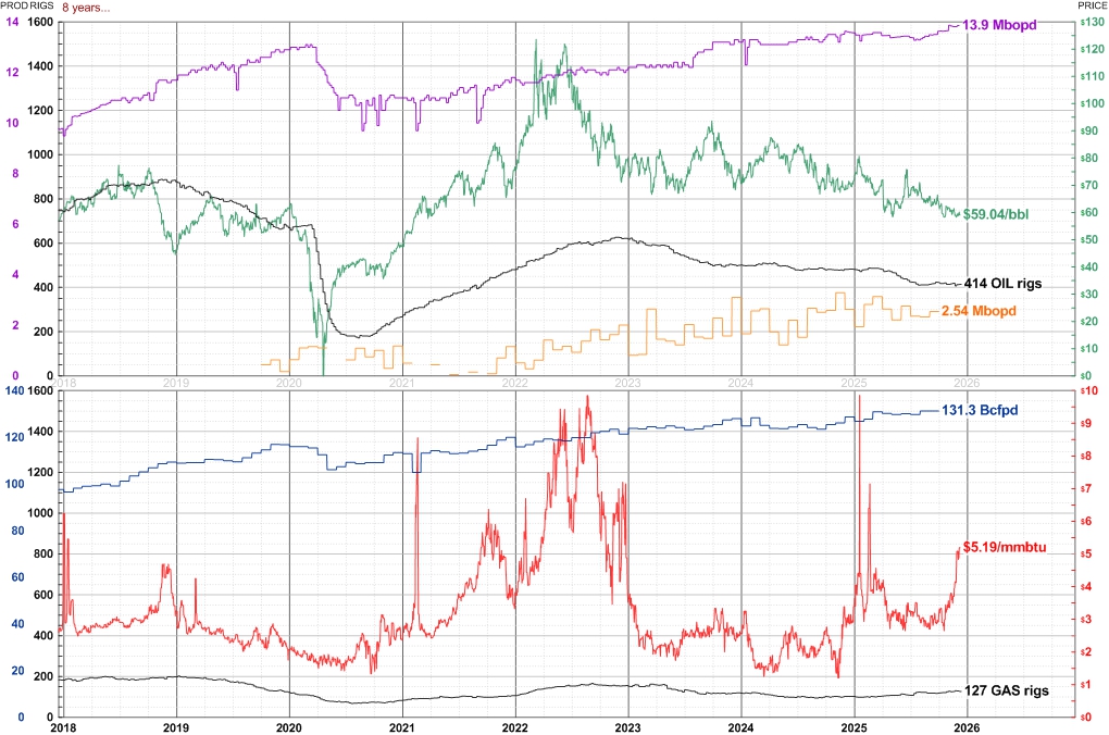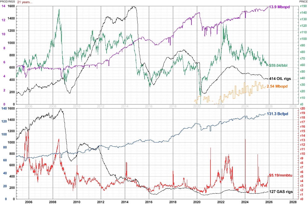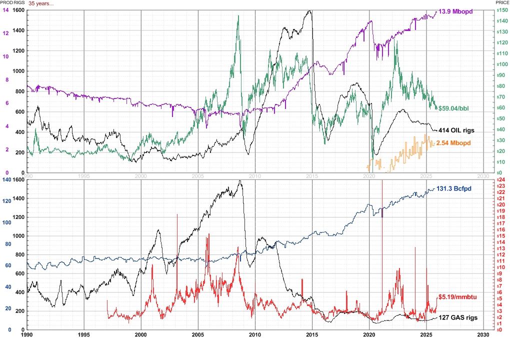 Recent public domain values and historical graphs of USA oil and natural gas rotary drilling rig counts, spot prices, and production rates follow. Images link to enhanced vector-pdfs and may be reproduced without notice.